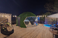 Глэмпинг-сфера принимает гостей 365 дней в году. Находится дом на деревянной террасе со встроенным индивидуальным бассейном. На террасе беседка с мебелью, кресло-кокон, мягкие лежаки, подсветки, зелёные зоны, качели, столы и кресла.