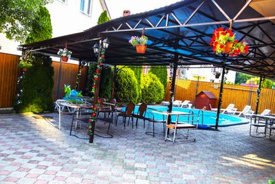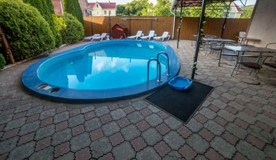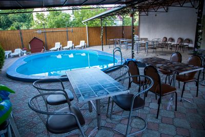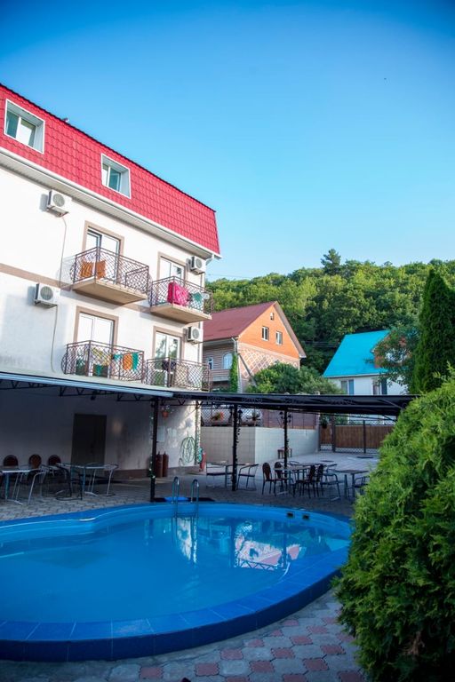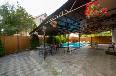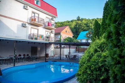 На территории просторный дворик, бассейн 5*8 м, глубина 1, 5 метра ( работает только в летний период) ,зона отдыха… с wi-fi, мангал, оборудованная кухня для самостоятельного приготовления еды, детская площадка, оборудованная качелями. В шаговой доступности пятерочка, магнит и круглосуточные кафе.