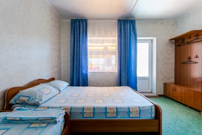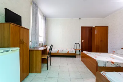 Второе здание состоит из трех этажей, на первом расположены номера категории «Стандарт». Площадь составляет 16 кв. м. Комната светлая, меблированная, есть… кондиционер, ТВ, холодильник.